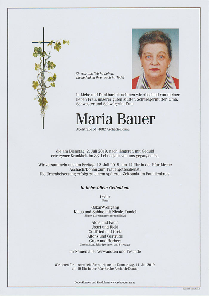 Anna Schauptmayr - Bestattung Aschach a. d. Donau | Grünauerstraße 19 | 4082 Aschach/Do. | +43 (0)7273 6450